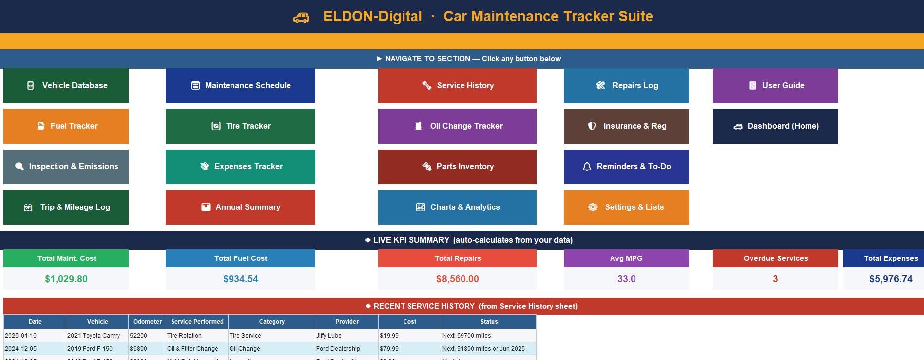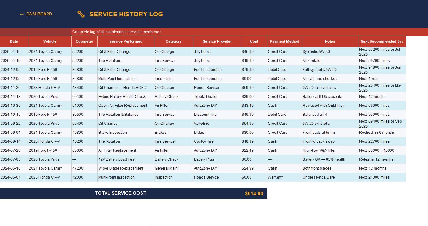 Overdue service alerts β red/yellow/green conditional formatting highlights what needs attention