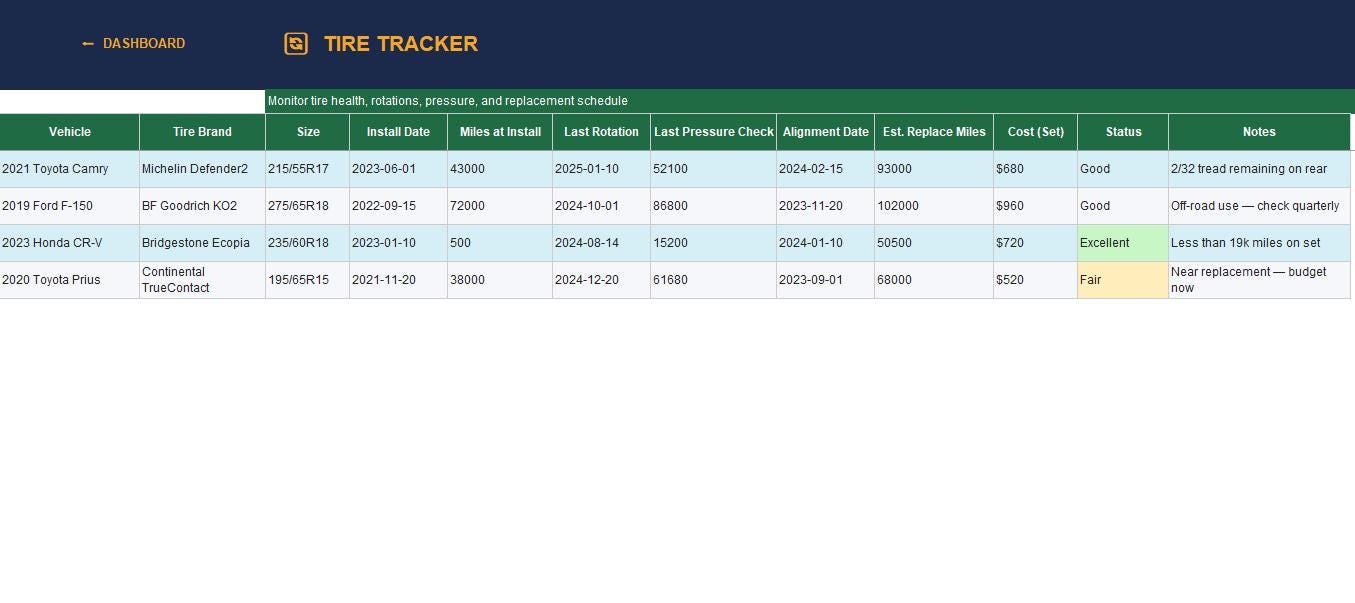 π Tire Tracker β Brand, rotation history, pressure & replacement schedule