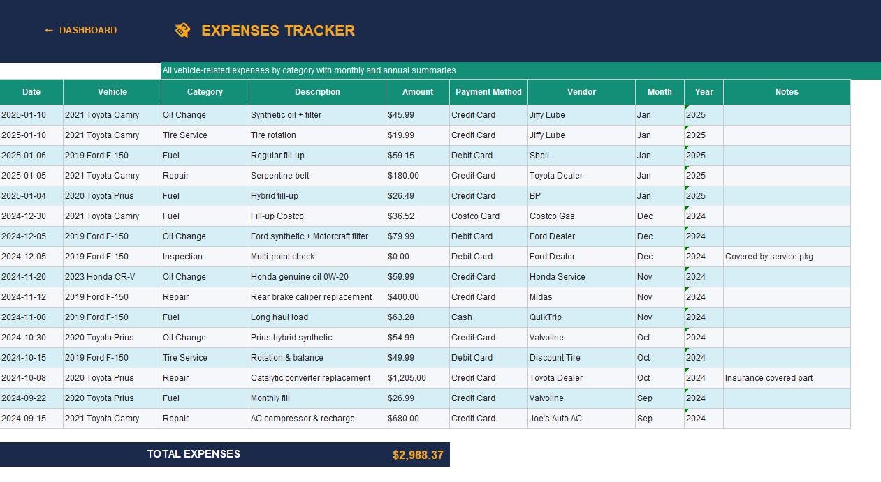 π§ Stop losing track of oil changes, tire rotations, and repair bills. This is the ultimate all-in-one vehicle maintenance spreadsheet β built for car owners, families with multiple vehicles, rideshare drivers, fleet managers, and small business owners who want a professional, organised, and completely stress-free way to manage every aspect of their vehicles.