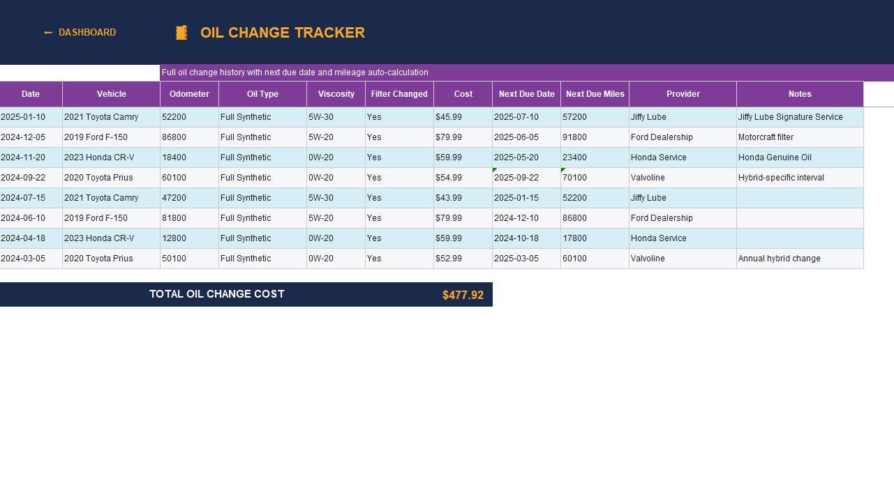 π’οΈ Oil Change Tracker β Next due date & mileage auto-formula