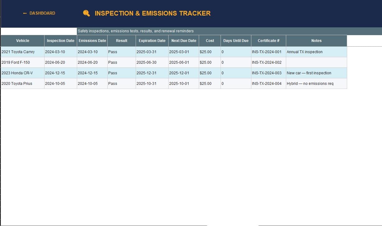 π Inspection & Emissions Tracker β Pass/fail log & renewal countdown
