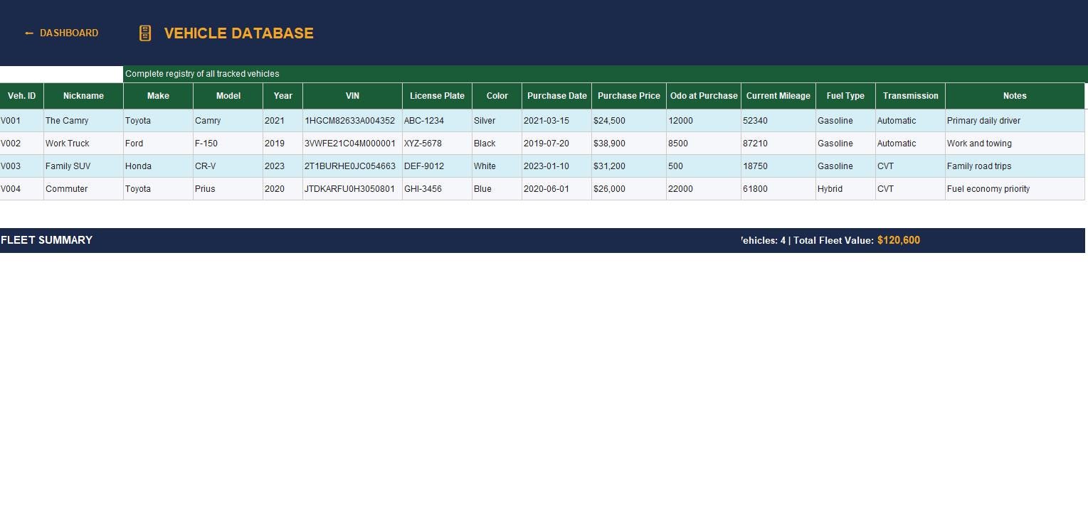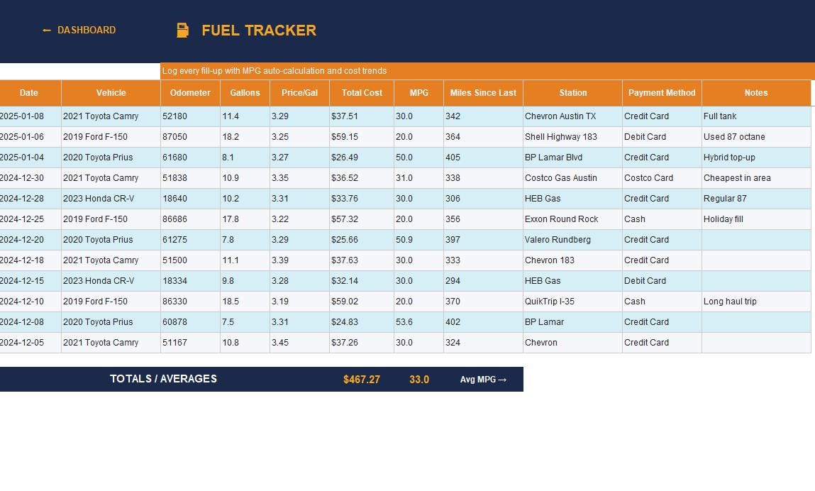 Files are available immediately after purchase β no waiting, no shipping. Download, open in Excel or Google Sheets, and start tracking your vehicles today. Works on Windows, Mac, iPhone, iPad, and Android.