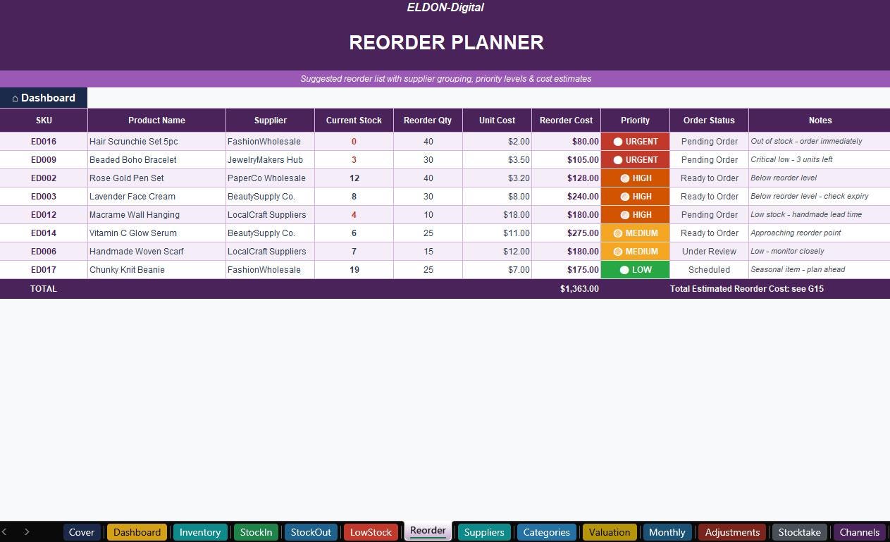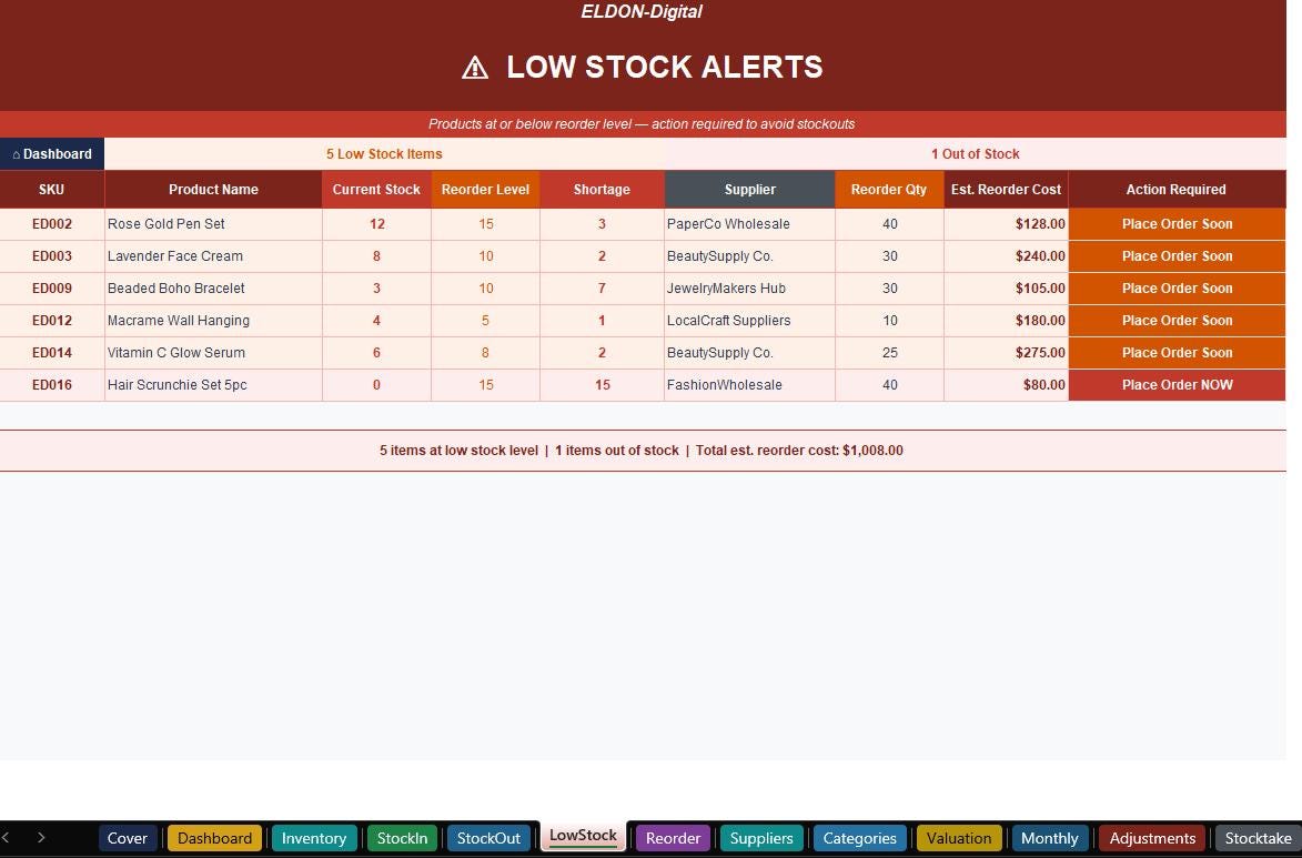 Take full control of your business inventory with this premium, ready-to-use Inventory Tracker by ELDON-Digital. Whether you run an Etsy shop, online store, boutique, pop-up market, or handmade business β this professional spreadsheet does the heavy lifting for you. πͺβ¨