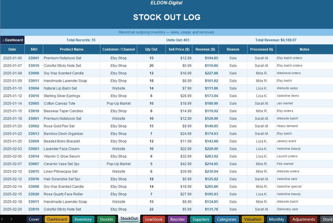 π€ Stock Out Log β Log every sale or removal across all your channels with auto-calculated revenue.