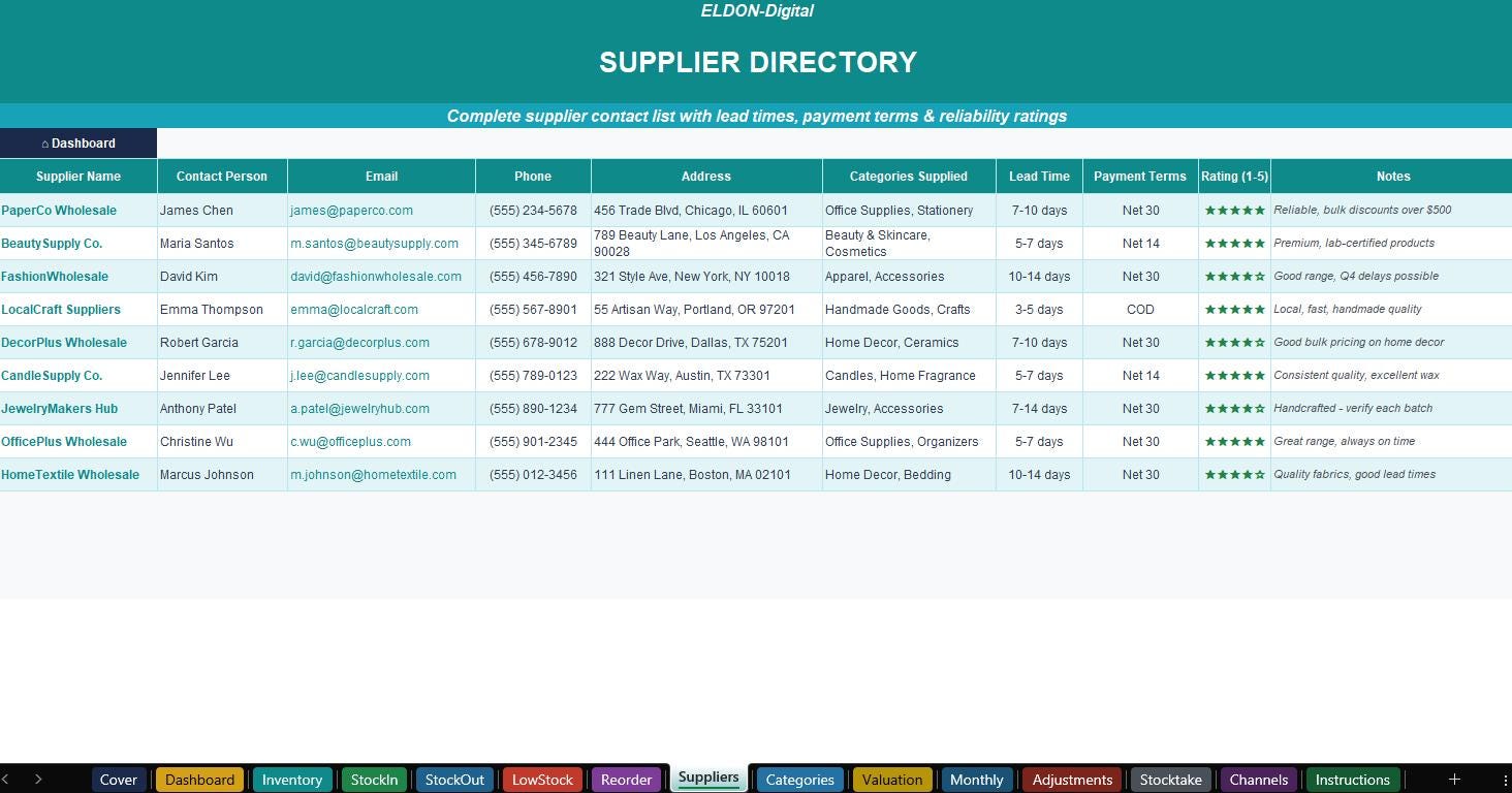 π Supplier Directory β 9-field contact list with lead times, payment terms & star reliability ratings.