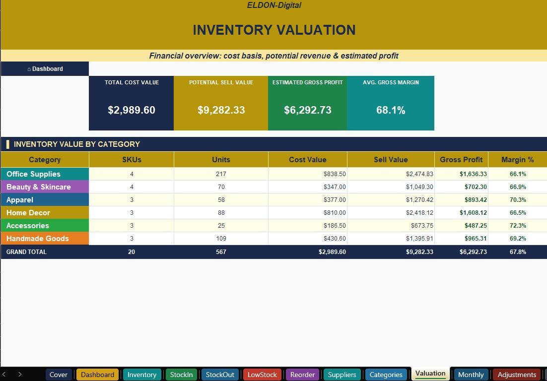 π° Inventory Valuation β See your full cost basis, potential revenue & estimated gross profit at a glance.