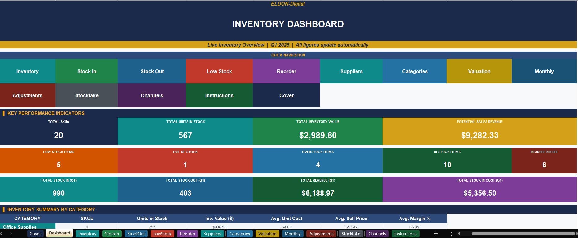 π Live Dashboard β 10+ KPI cards showing Total SKUs, Units in Stock, Inventory Value, Revenue, Low Stock & Out of Stock counts β all updating automatically.