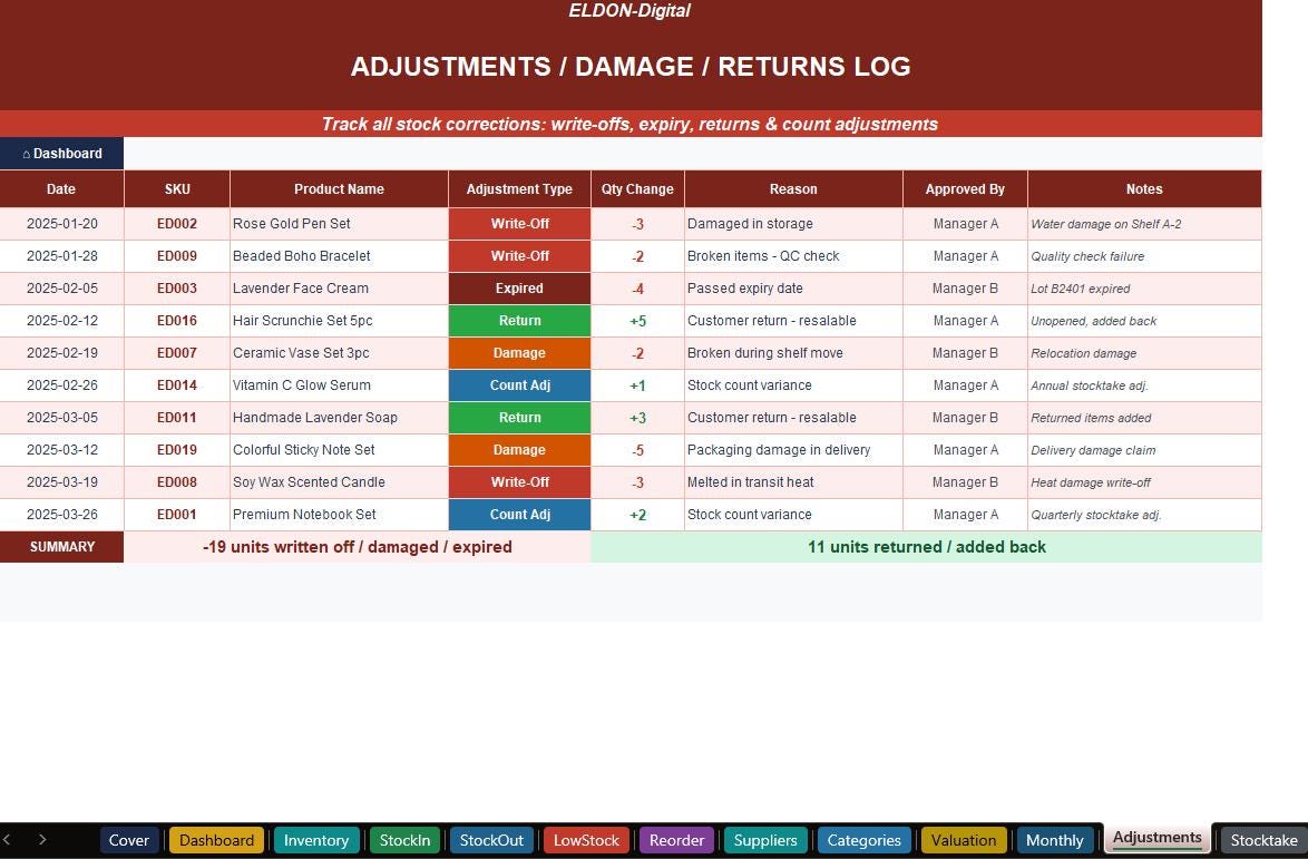 π§ Adjustments Log β Record damage, expiry, returns & stock count corrections.