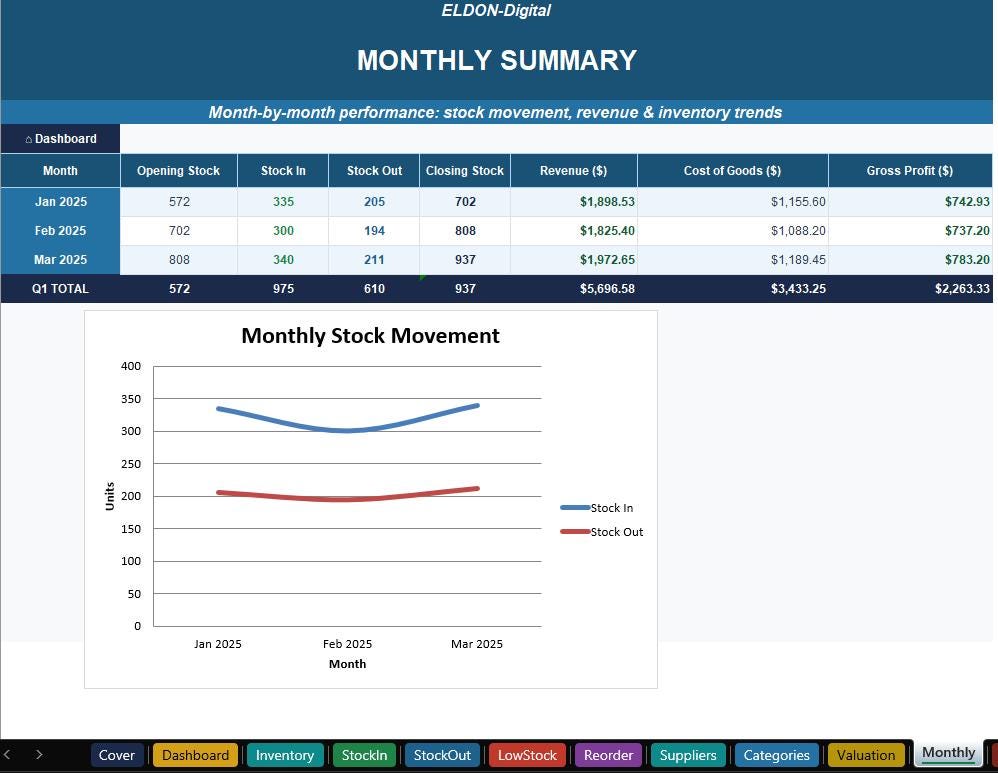 Monthly Summary β Track opening stock, stock in/out, closing stock, revenue & profit month by month with trend charts.