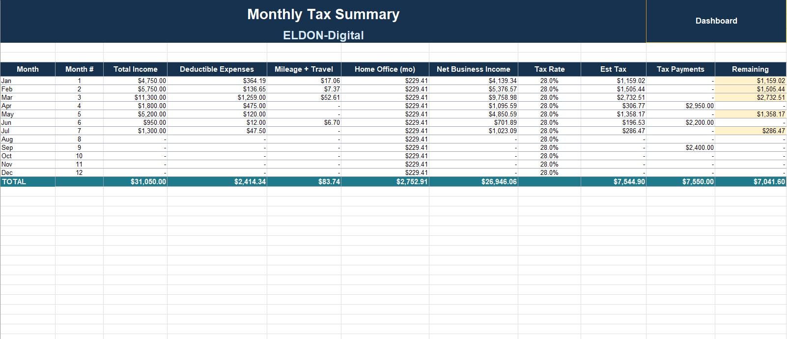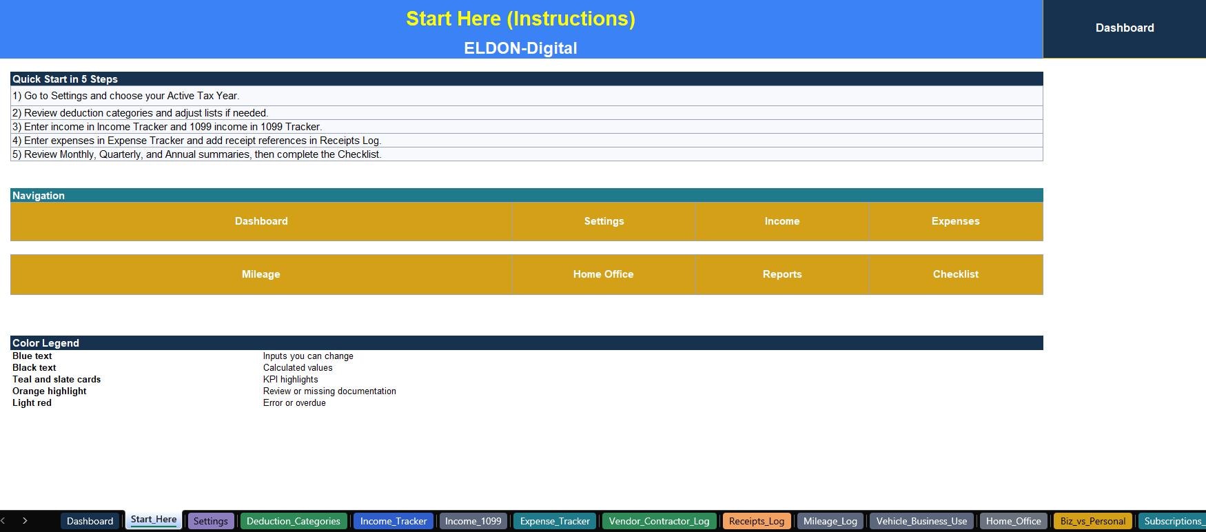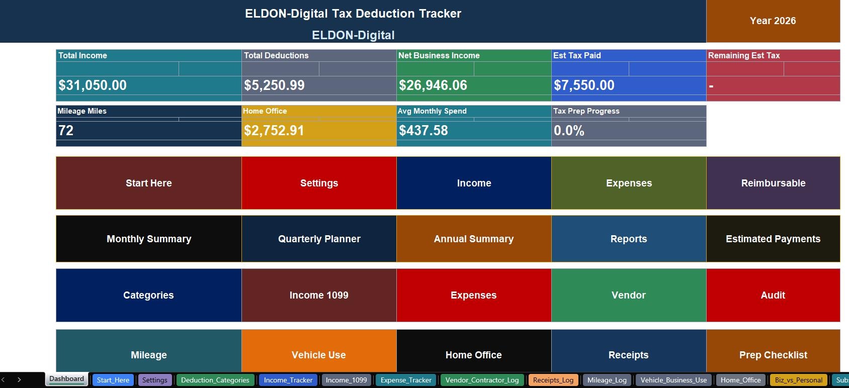 Designed for self-employed professionals, freelancers, 1099 workers, small business owners, side hustlers, and solopreneurs, this powerful spreadsheet system helps you manage your income, deductible expenses, mileage, home office costs, tax payments, receipts, and year-end tax prep in one beautiful and easy-to-use place.