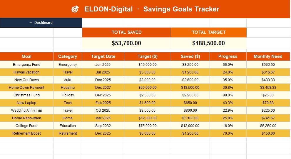 π― Savings Goals β Track up to 10+ savings goals with target, saved amount, progress %, and monthly contribution needed