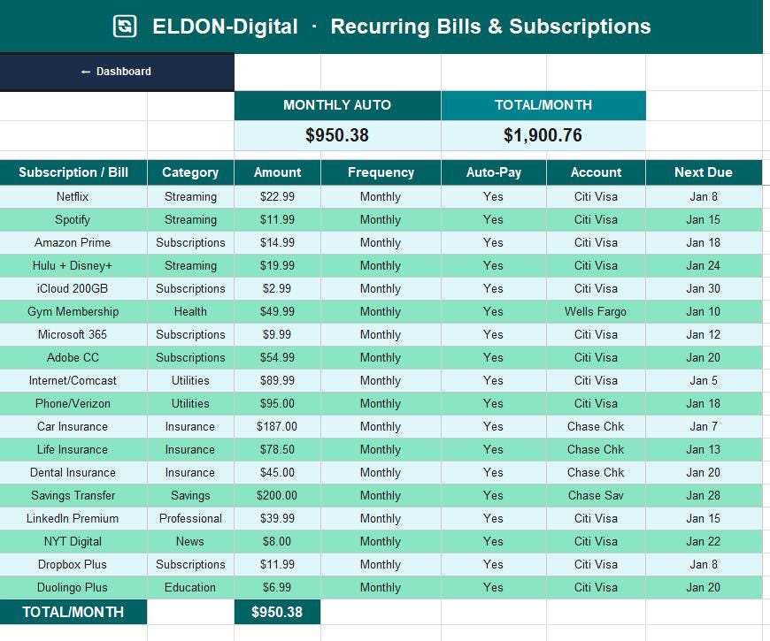 π Recurring Bills β Master list of all subscriptions and auto-charges with annual cost calculation