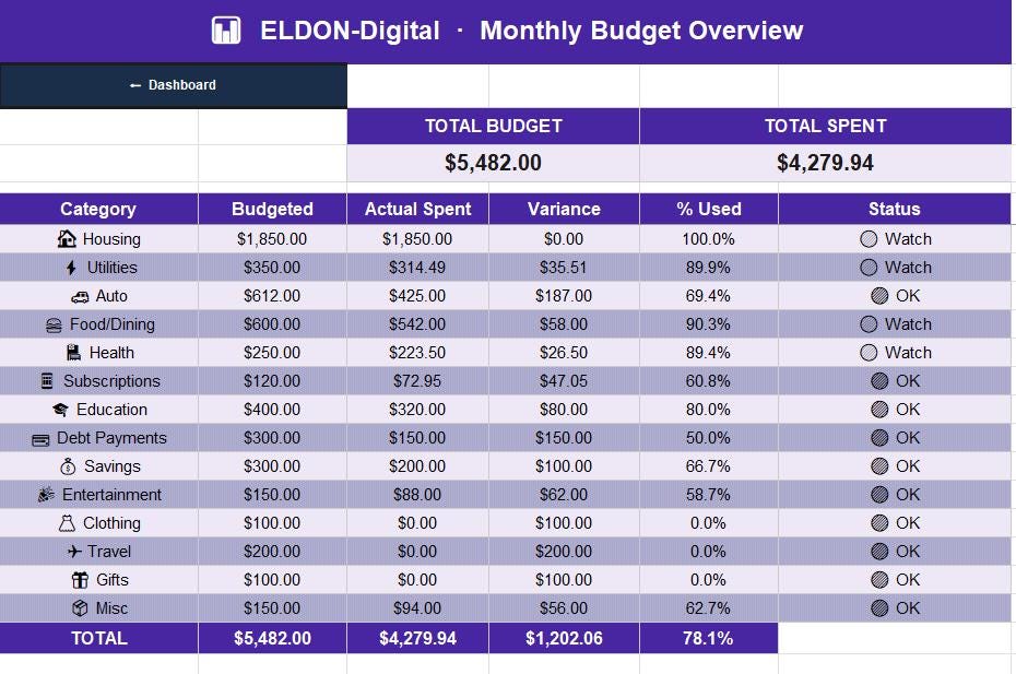 π Budget Overview β 14 spending categories with budgeted vs. actual comparison, variance calculation, and status flags (π’ OK / π‘ Watch / π΄ Over)