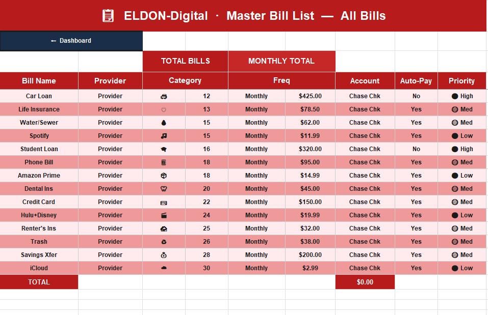 π Bill Master List β The source of truth for all your bills β name, provider, category, due day, frequency, amount, account, auto-pay status, and priority. Feeds all 12 monthly calendars automatically