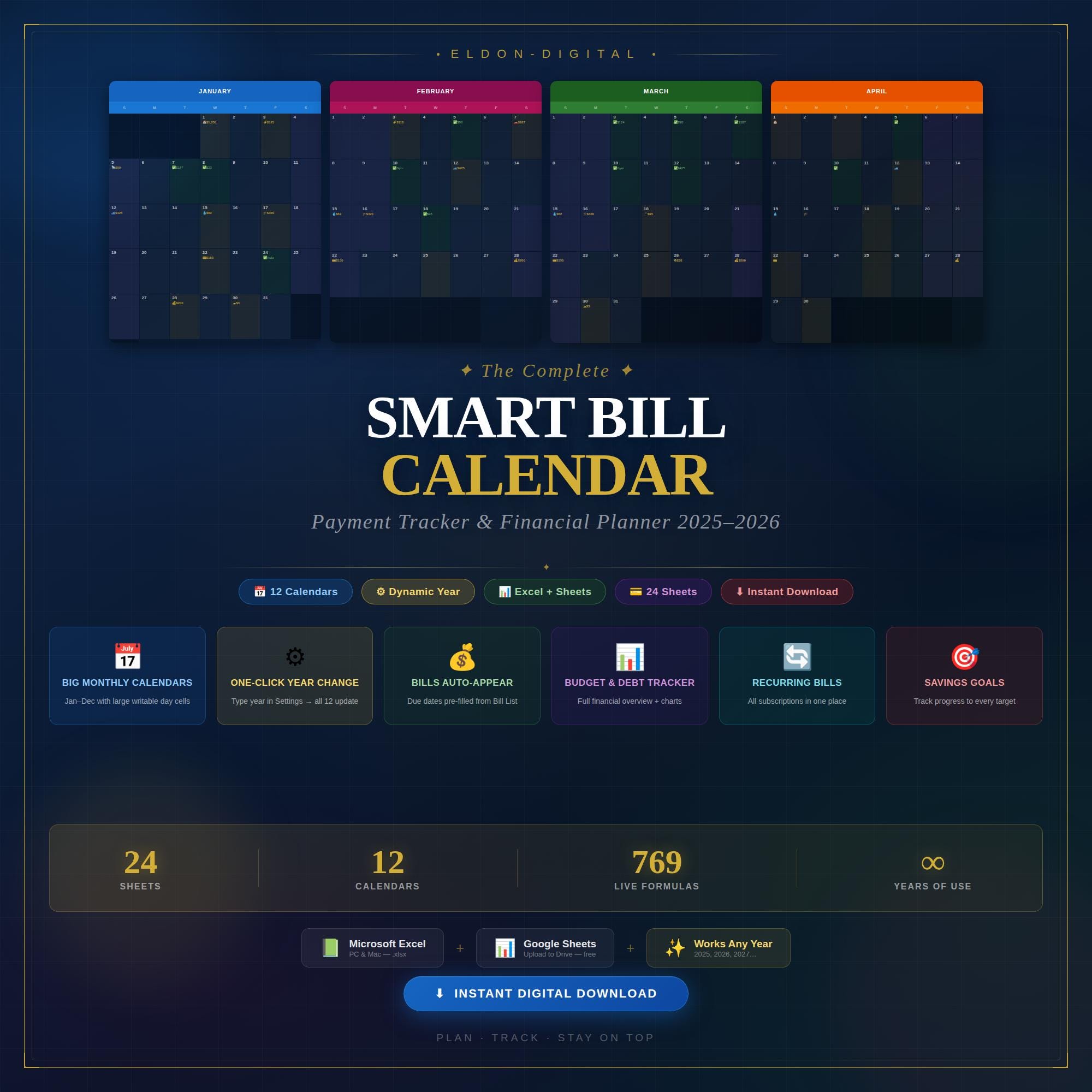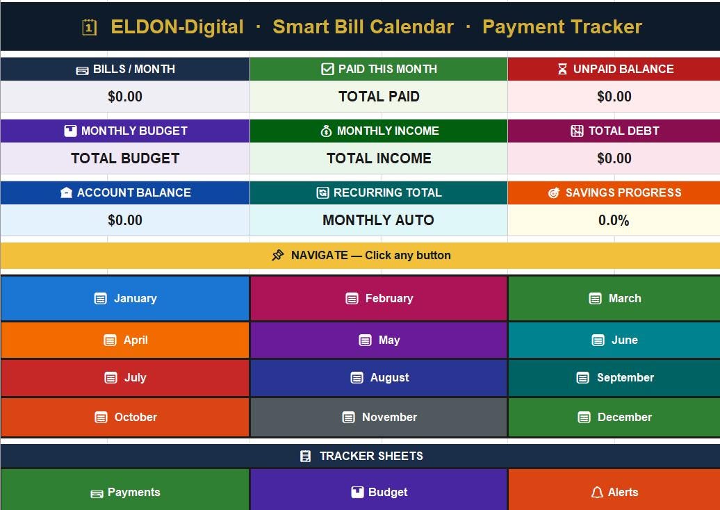 Take complete control of your finances with the ELDON-Digital Smart Bill Calendar & Payment Tracker β a beautifully designed, fully automated spreadsheet system that organizes every bill, payment, and financial deadline you have, all in one powerful digital planner. Available instantly for both Microsoft Excel AND Google Sheets.