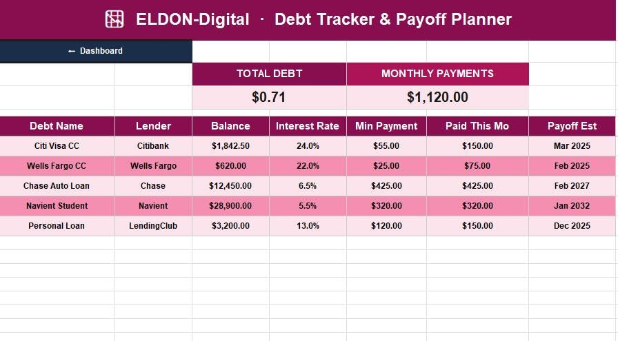 π Debt Tracker β Monitor every debt with interest rate, minimum payment, strategy (avalanche/snowball), and estimated payoff date