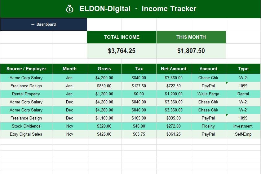 π° Income Tracker β Log all income sources with gross, tax withheld, and net calculations. Monthly trend line chart included