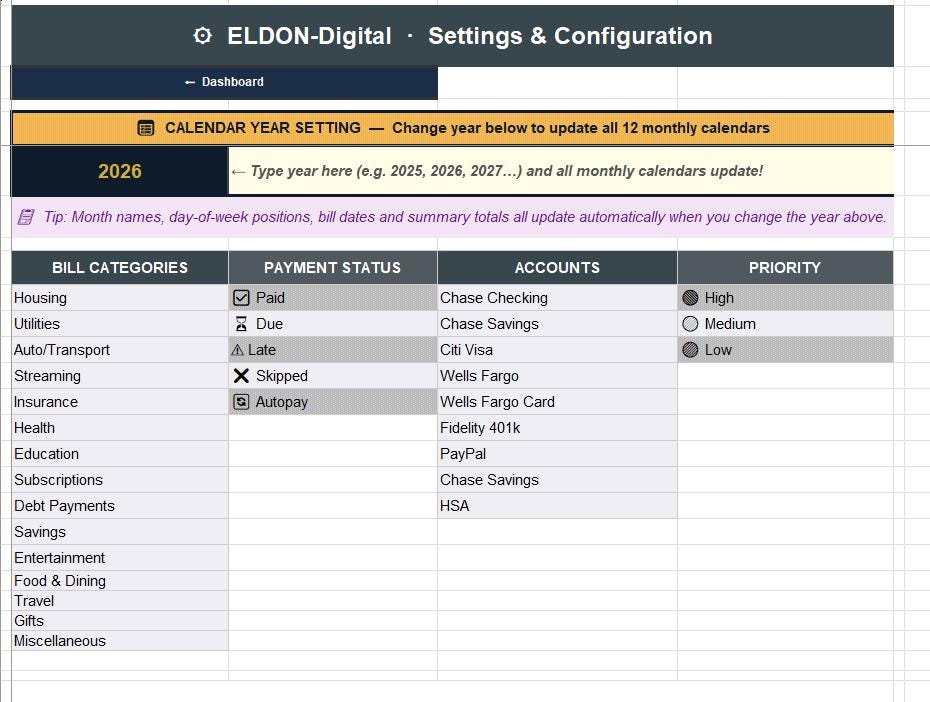βοΈ Settings β Customize dropdown lists for categories, payment status, accounts, and priority levels. Contains the Year Input Cell that controls all 12 calendars