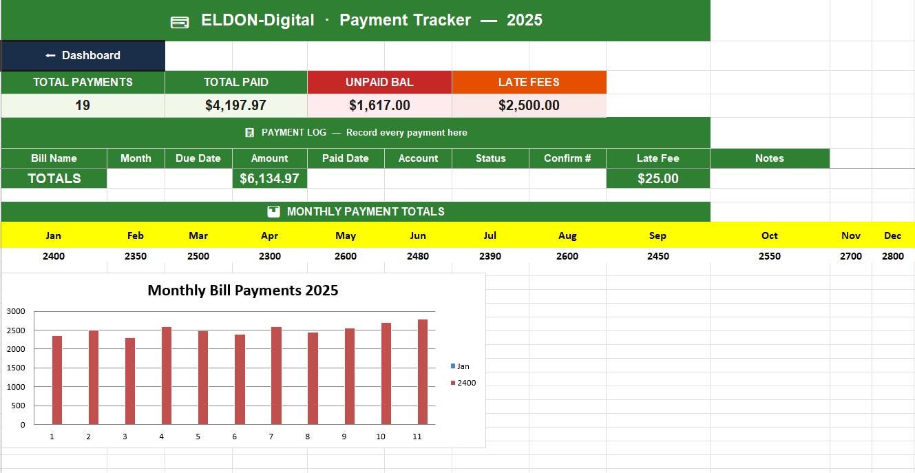 π³ Payment Tracker β Log every payment with date, confirmation number, account, status, and late fee. Monthly bar chart updates automatically