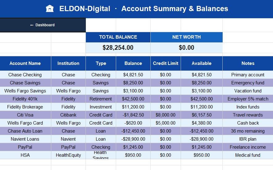 π¦ Account Summary β Track all checking, savings, investment, credit card, and loan accounts in one place with live net worth calculation