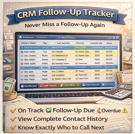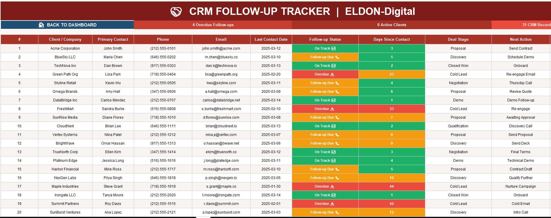π€ CRM Follow-Up Tracker β Never miss a follow-up again. Color-coded statuses (On Track β