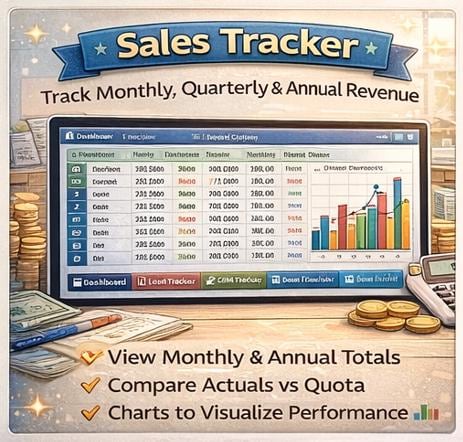 π Sales Tracker β Track monthly, quarterly, and annual revenue. See attainment %, average deal size, and compare performance to quota with beautiful built-in charts. π