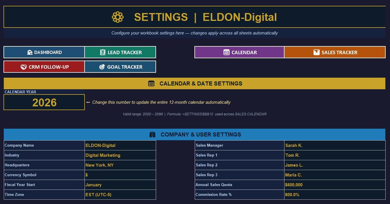βοΈ Settings Sheet β Your command center. Change the year and your entire 12-month calendar rebuilds automatically. Customize your company name, rep names, monthly quotas, commission rates, and more β all in one place.