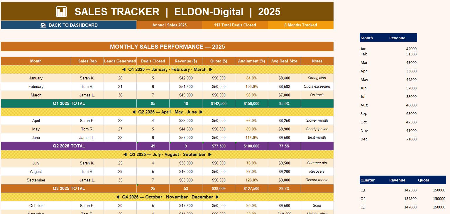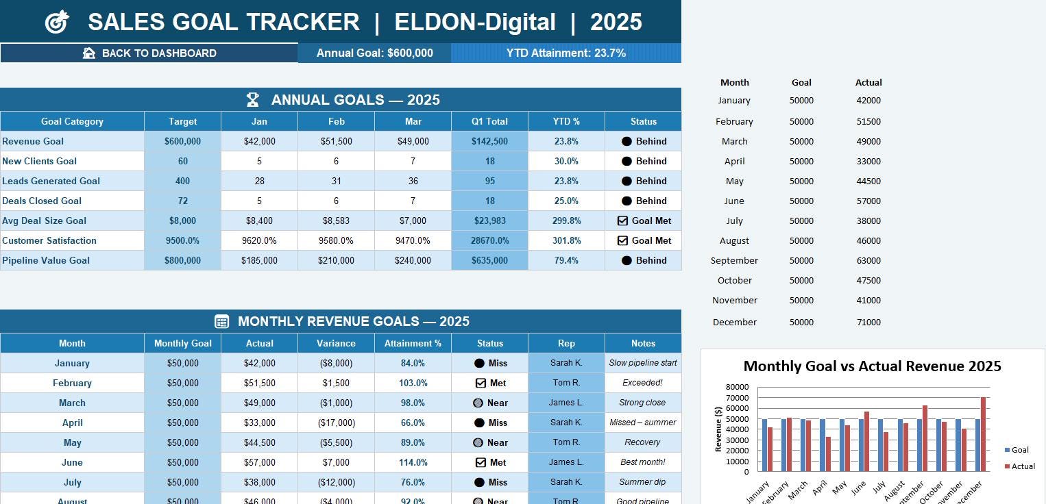 π― Sales Goal Tracker β Set monthly, quarterly, and annual goals. Track variance, attainment %, and get automatic status flags (Met / On Track / Behind) powered by smart formulas. π