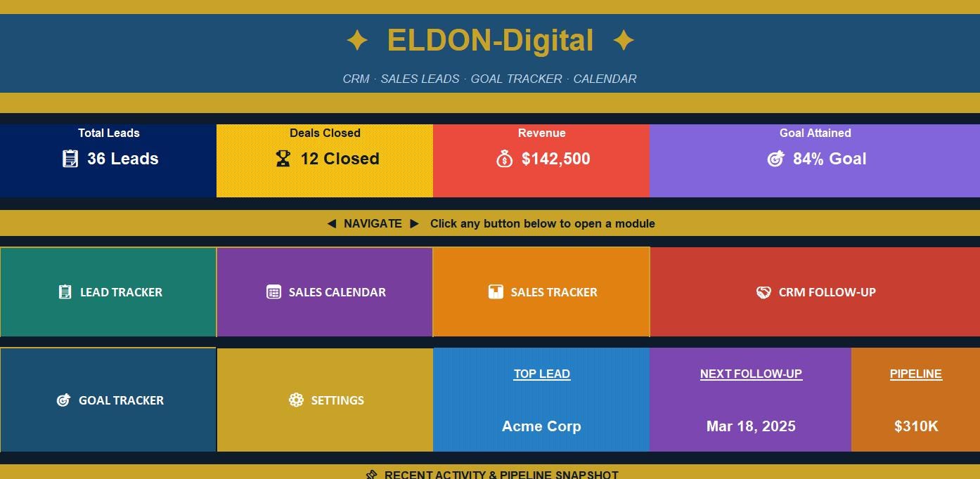 Introducing the ELDON-Digital Sales CRM & Lead Tracker β the ultimate all-in-one Excel spreadsheet built for sales professionals, freelancers, and small business owners who are serious about closing more deals and hitting their goals. πΌβ¨