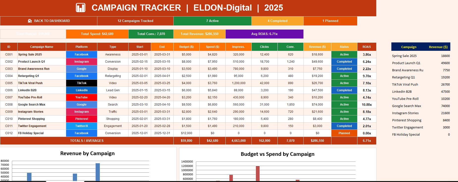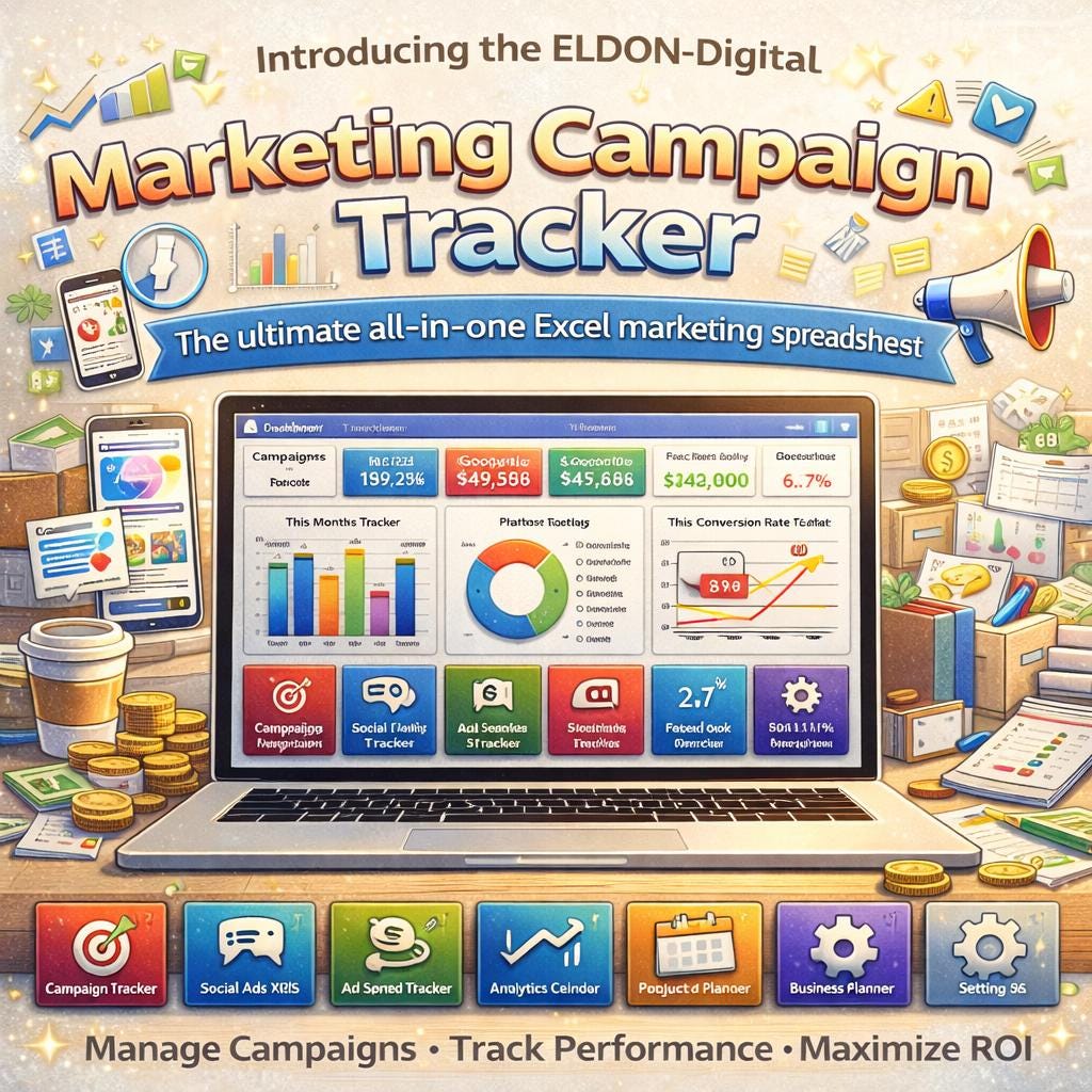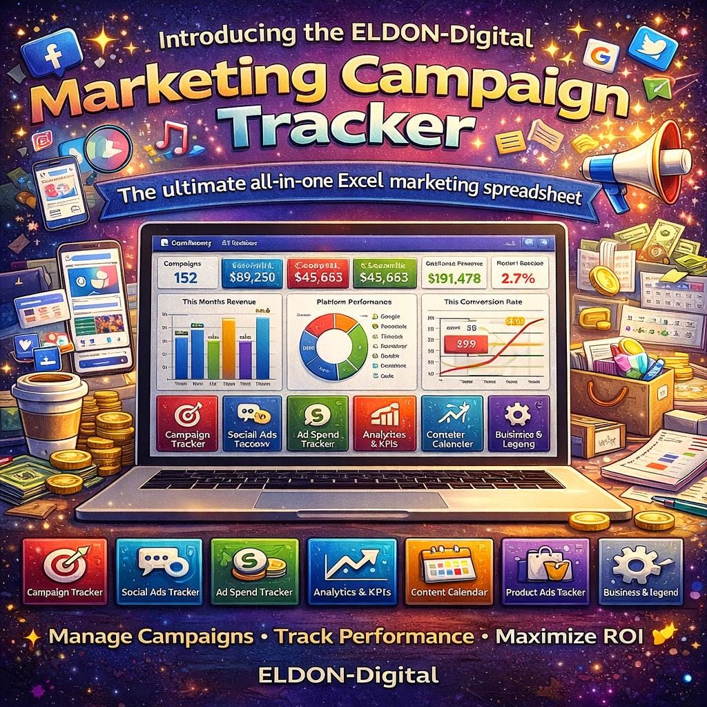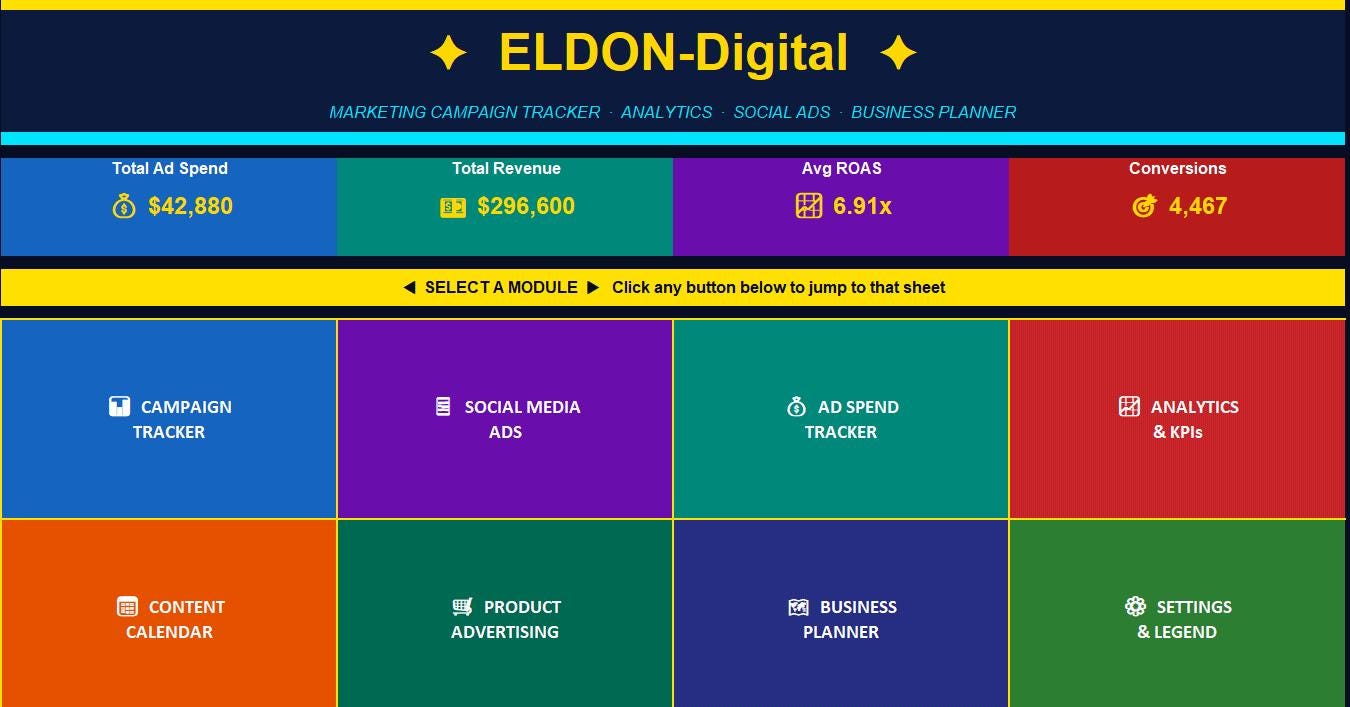Introducing the ELDON-Digital Marketing Campaign Tracker β the most comprehensive, beautifully designed marketing spreadsheet template built for marketers, small business owners, freelancers, and digital advertising professionals who are serious about tracking their results and scaling their ROI. πΌπβ¨