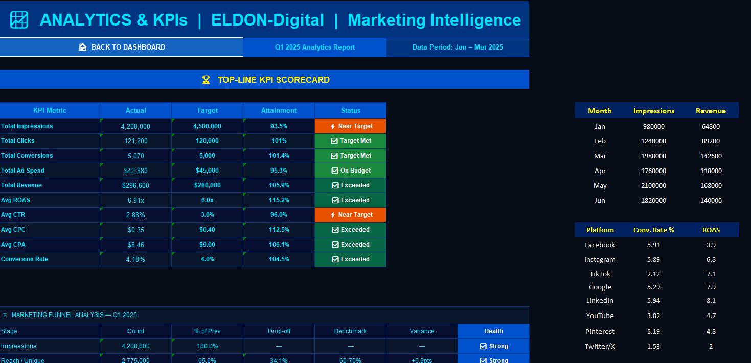 π Analytics & KPIs Dashboard β Your full marketing scorecard. Track 10 key KPIs against targets, analyze your entire marketing funnel from impressions to repeat purchase, and spot exactly where your funnel is leaking. π
