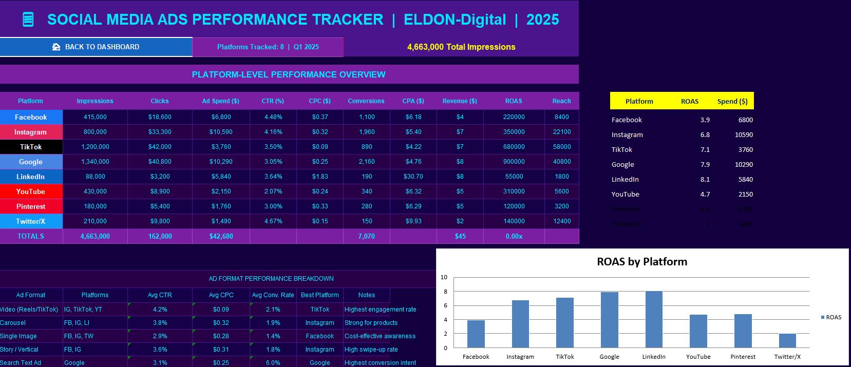 π± Social Media Ads Performance Tracker β Monitor your Facebook, Instagram, TikTok, Google, LinkedIn, YouTube, Pinterest, and Twitter/X ads side by side. Compare CTR, CPC, CPA, ROAS, and conversion rates across every platform at a glance. π