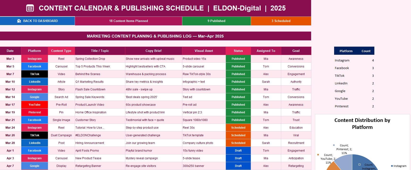 Content Calendar β Plan, schedule, and track every piece of content across all platforms. Log copy briefs, visual assets, assigned team members, publication status, and campaign goals β all in one organized view. ποΈ
