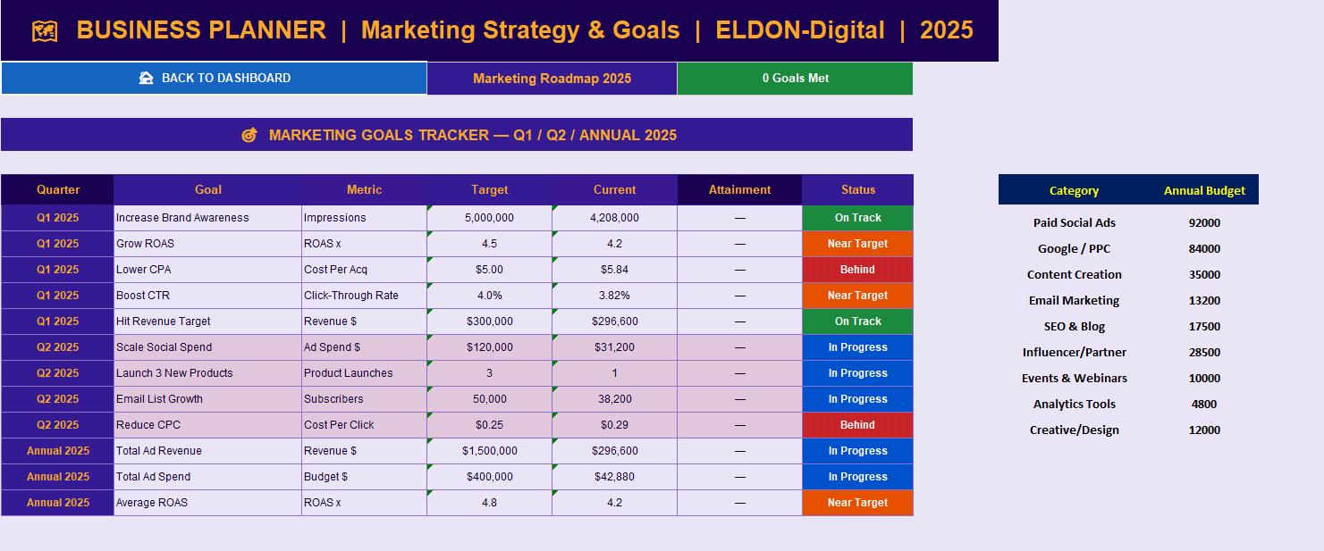 πΊοΈ Business Planner β Set and track Q1, Q2, and annual marketing goals. Plan your full annual marketing budget by category across all four quarters with automatic variance tracking. π