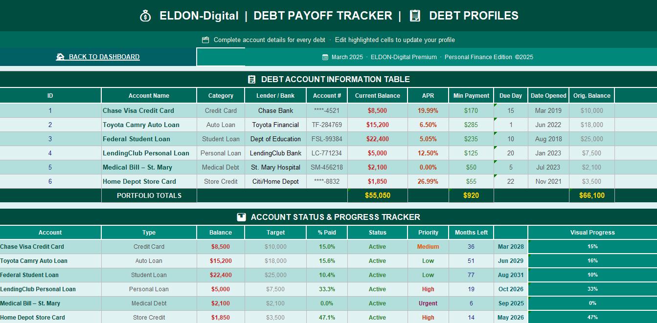 Say goodbye to financial stress and hello to a clear, organized plan! The ELDON-Digital Debt Payoff Tracker is a powerful, beautifully designed spreadsheet tool that helps you track, manage, and eliminate every dollar of debt โ all in one place.