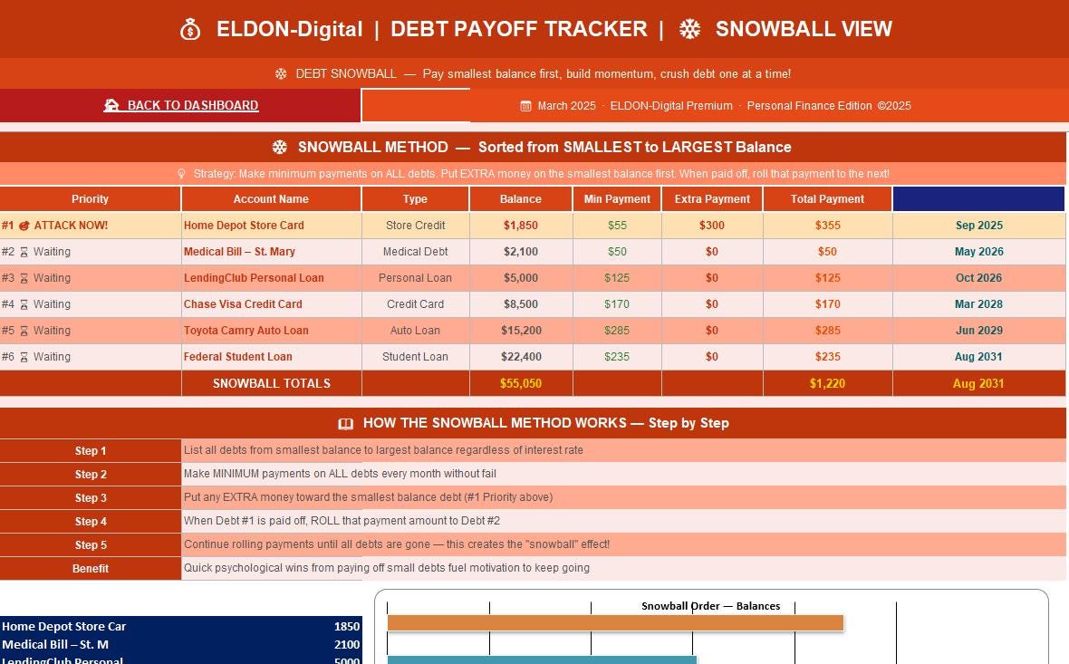 โข โ๏ธ Snowball View โ Pay off smallest balances first for quick wins & motivation