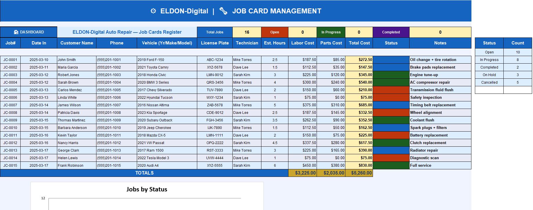 π Run your entire auto repair shop from a single Excel file. Whether you're an independent mechanic, a multi-bay garage, or a growing auto service center - this professionally built management system gives you everything you need to track jobs, manage customers, control inventory, send invoices, and grow your business. No expensive software subscriptions. No monthly fees. Just download, open, and go.