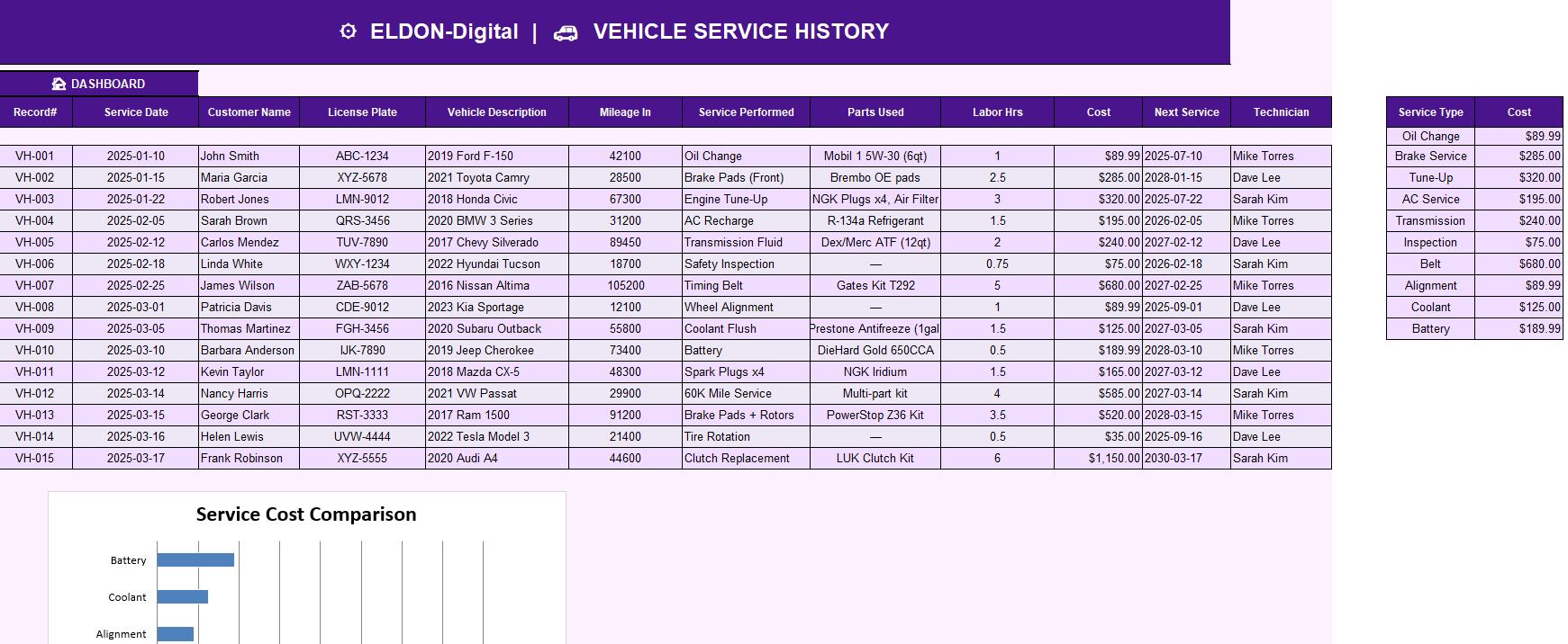 π Vehicle Service History - Maintain a complete service history for every vehicle including mileage, parts used, labor hours, costs, and next service due dates