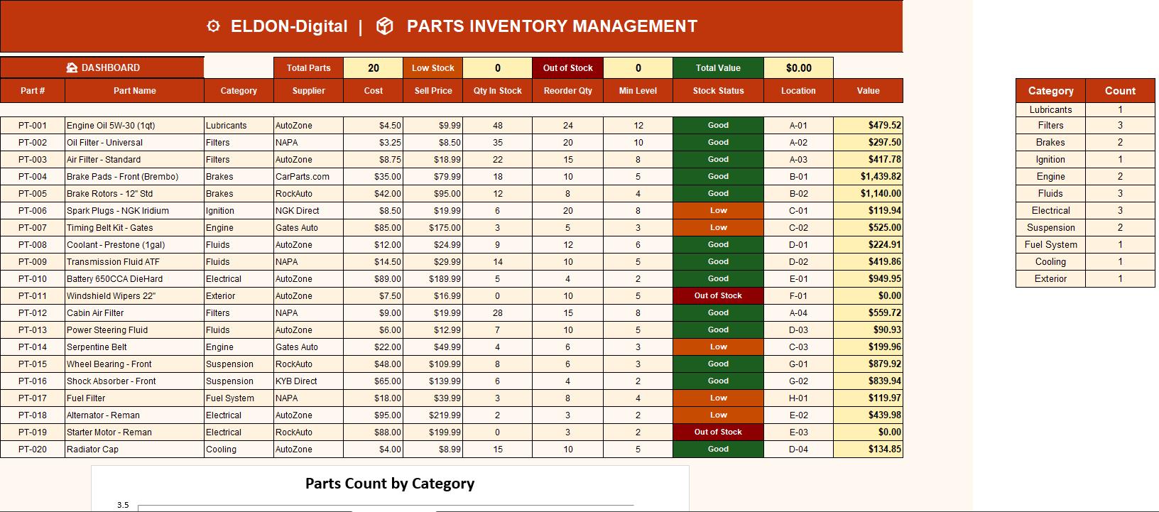 π¦ Parts Inventory - Track your entire parts stock with reorder alerts, low/out-of-stock warnings, supplier info, cost vs. sell price, and auto-calculated stock value