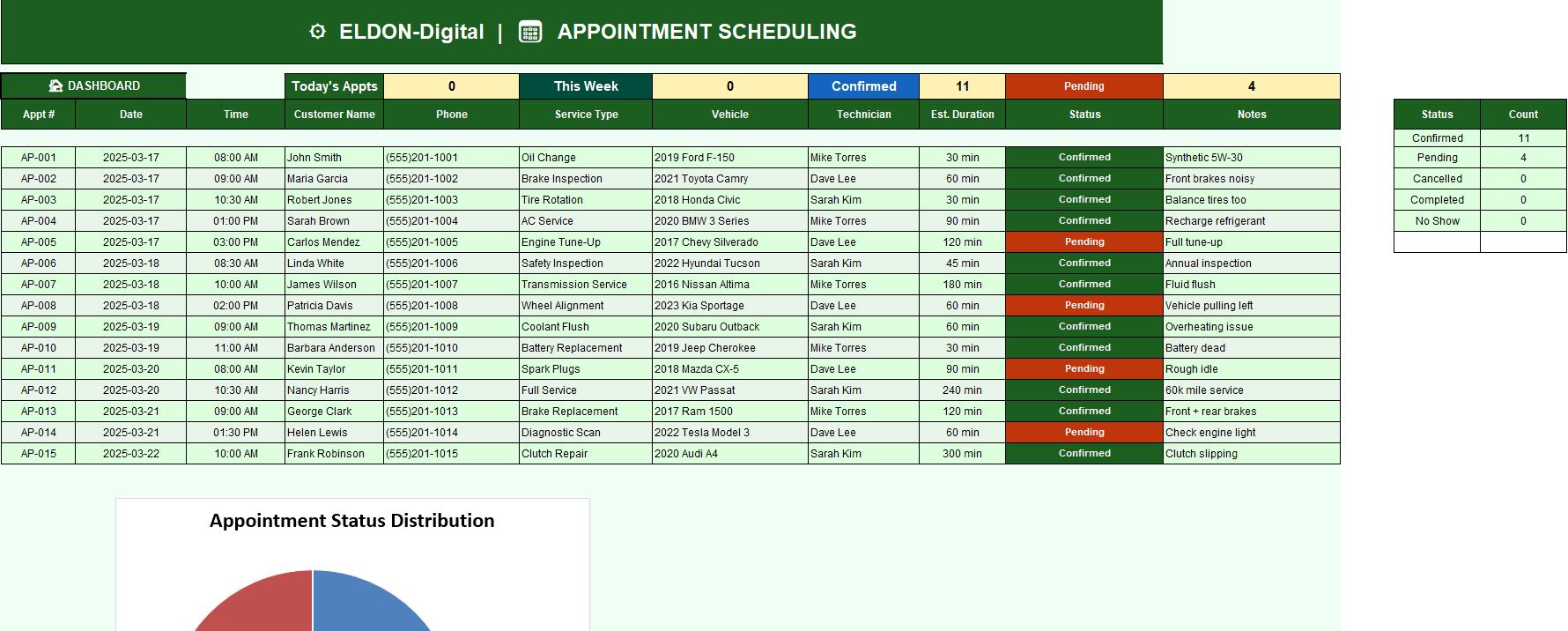 Appointment Scheduling - Book and manage all customer appointments with date, time, service type, technician assignment, and status tracking (Confirmed / Pending / Cancelled)