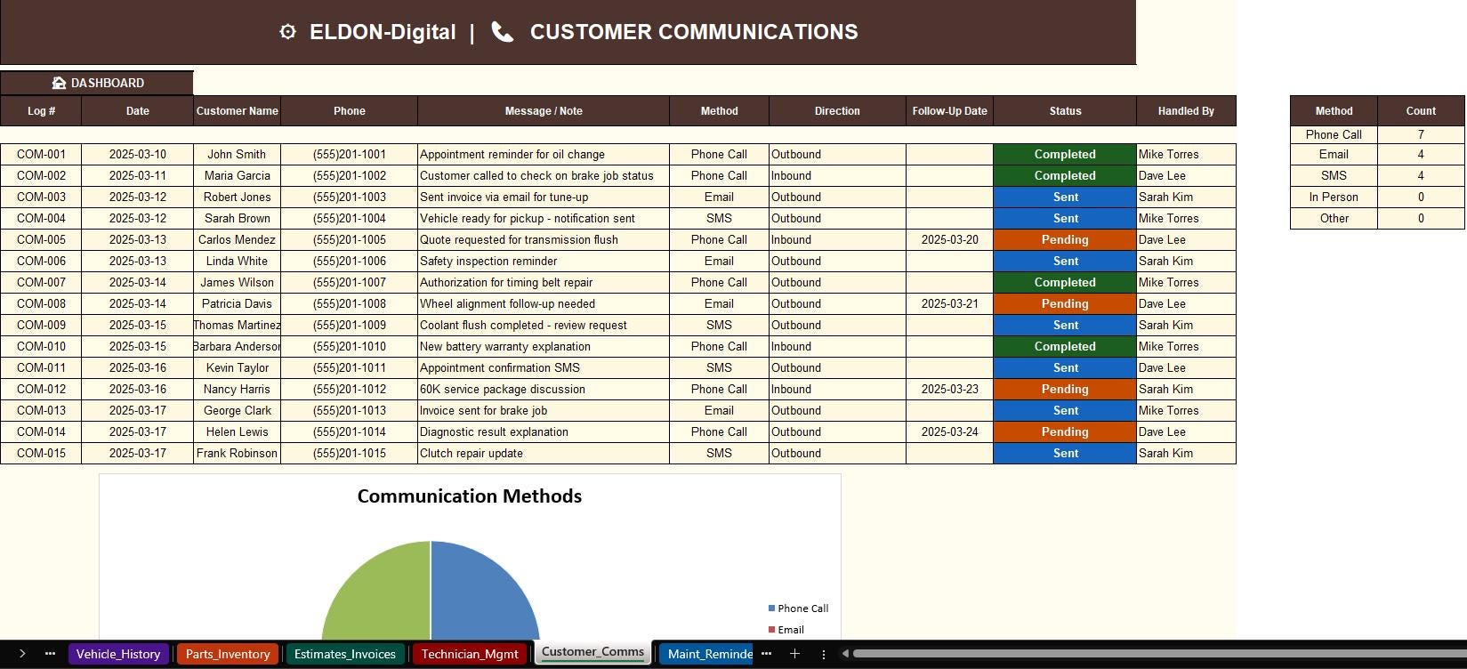 π Customer Communications - Log every customer interaction - calls, emails, texts - with follow-up dates, direction (inbound/outbound), and communication method tracking
