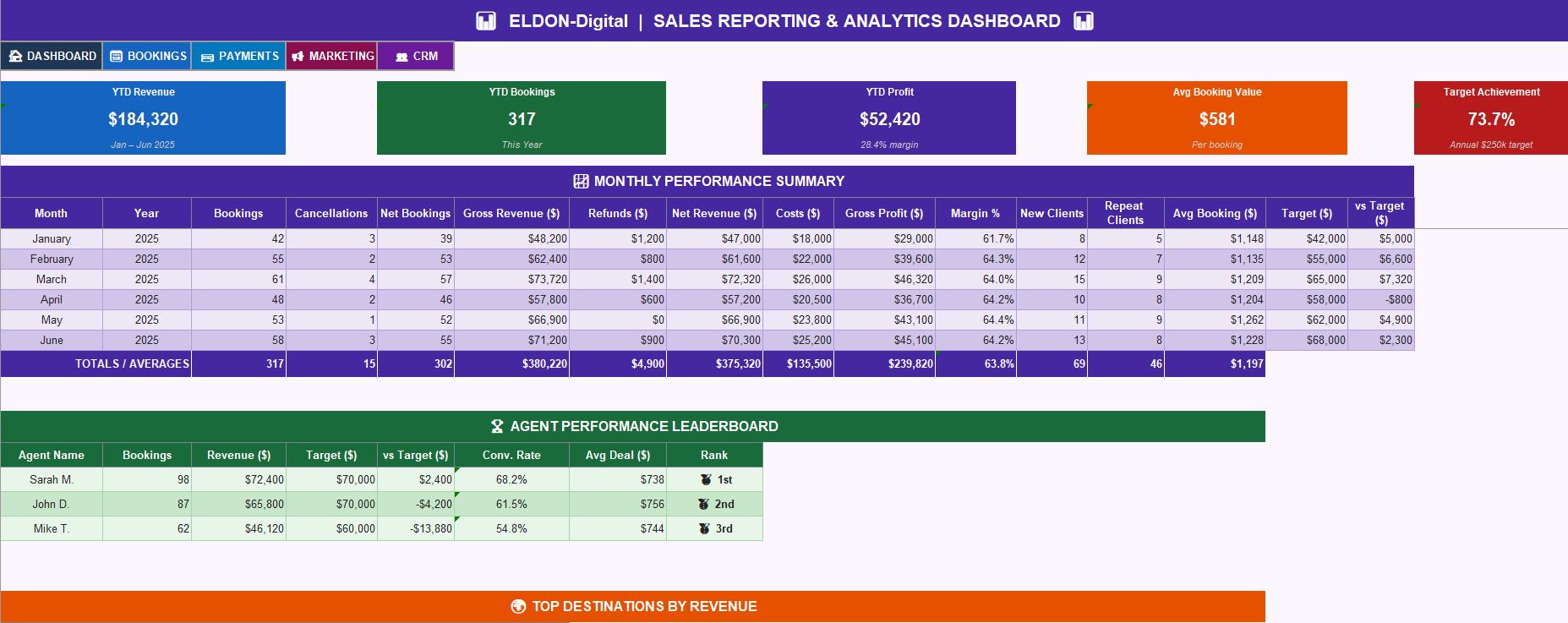 ๐ 11. SALES REPORTING & ANALYTICS Monthly P&L performance table, Agent Leaderboard with rankings ๐ฅ๐ฅ๐ฅ, Top Destinations by Revenue, and auto-updating Line & Bar charts. Export to PDF for monthly management reports.