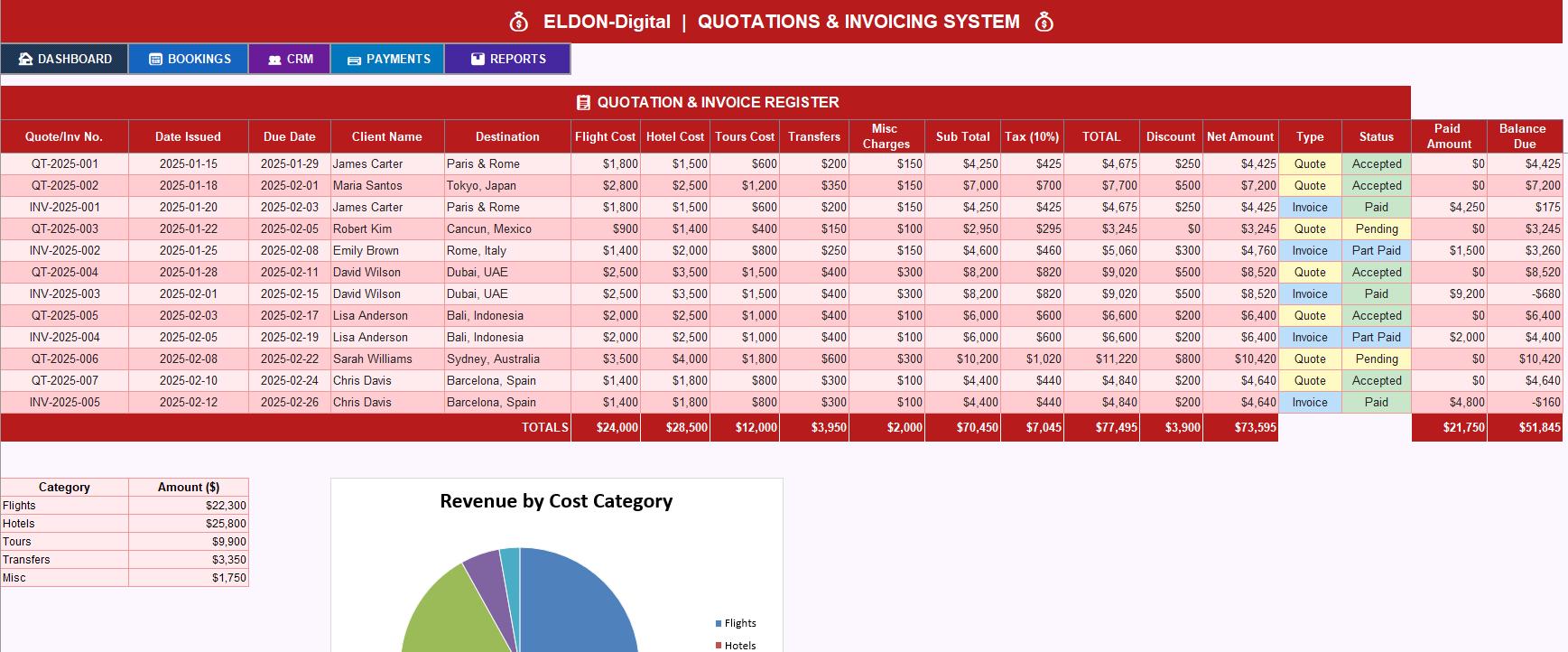 ๐ 1. MASTER DASHBOARD Your command center! Beautiful color-coded navigation buttons instantly take you to any module. Live KPI boxes show Total Bookings, Revenue, Active Clients & Pending Quotes at a glance.