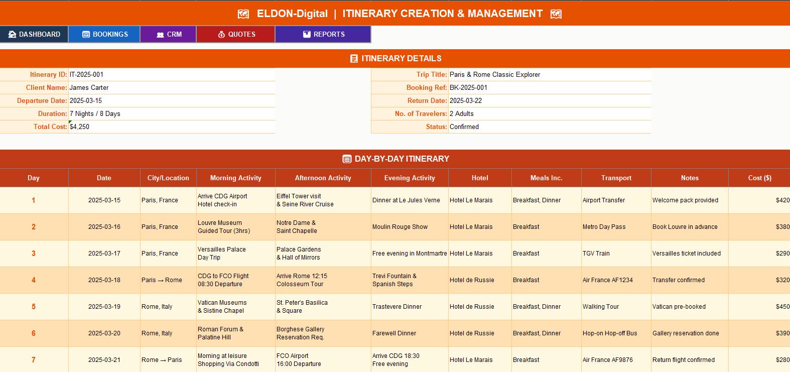 ๐บ๏ธ 3. ITINERARY CREATOR Build stunning day-by-day travel itineraries for your clients. Morning, afternoon & evening activities, hotel assignments, meals, transport, and per-day costs โ all in one clean, printable layout.