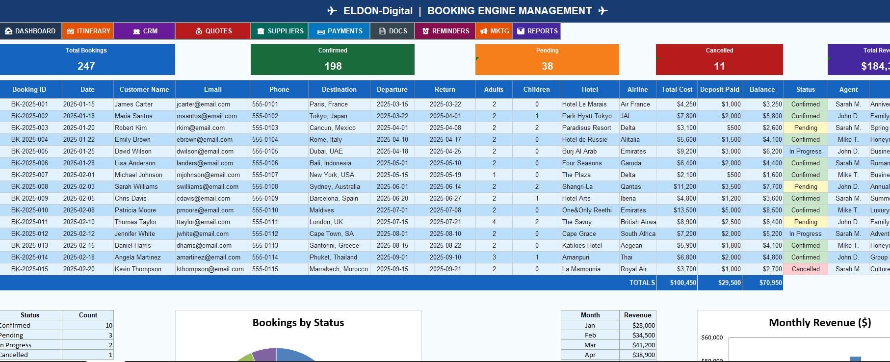 2. BOOKING ENGINE Log and manage every client booking with full details โ destination, flights, hotels, travel dates, agents, costs, deposits and auto-calculated balances. Includes status tracking (Confirmed / Pending / In Progress / Cancelled) with color-coded cells and built-in charts.