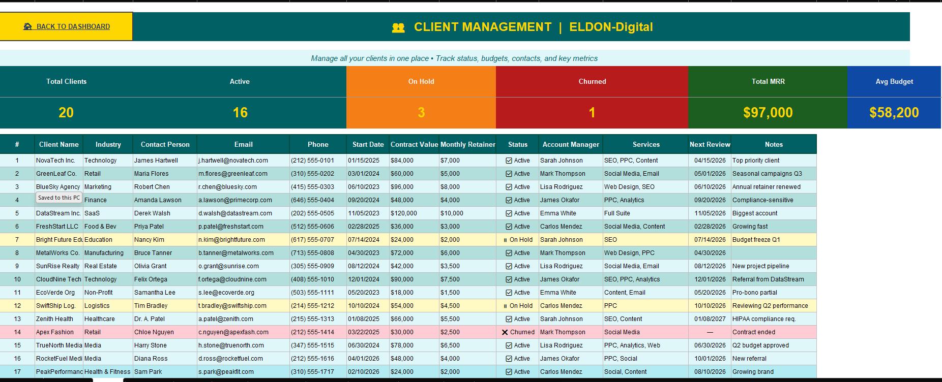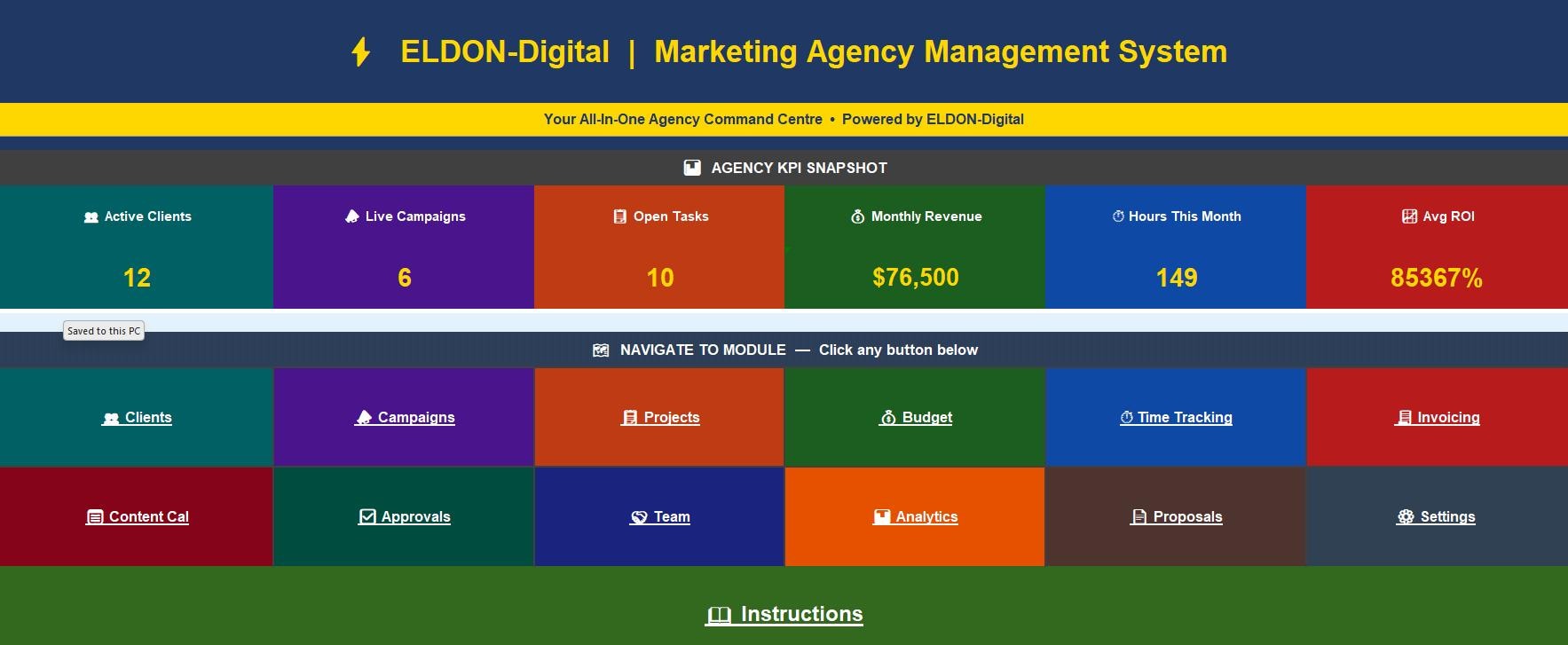 β‘ ELDON-Digital β Marketing Agency Management System The Ultimate All-In-One Excel Workbook for Marketing Agencies, Freelancers & Digital Consultants