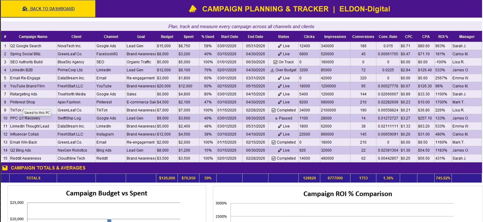 π£ Campaign Planner β Log campaigns across Google Ads, Facebook, Instagram, LinkedIn, TikTok, YouTube, Email, SEO, and more. Budget vs. spent, CTR, CPC, CPA, Conversions, and ROI all calculate automatically.