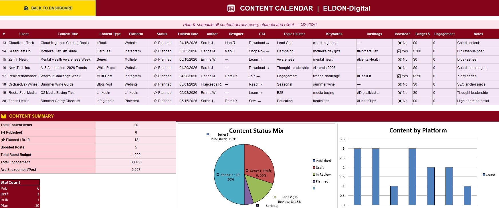 Content Calendar β Plan all content across every platform and client. Track status from Planned β Draft β In Review β Published. Log engagement metrics and boost budgets after publishing.