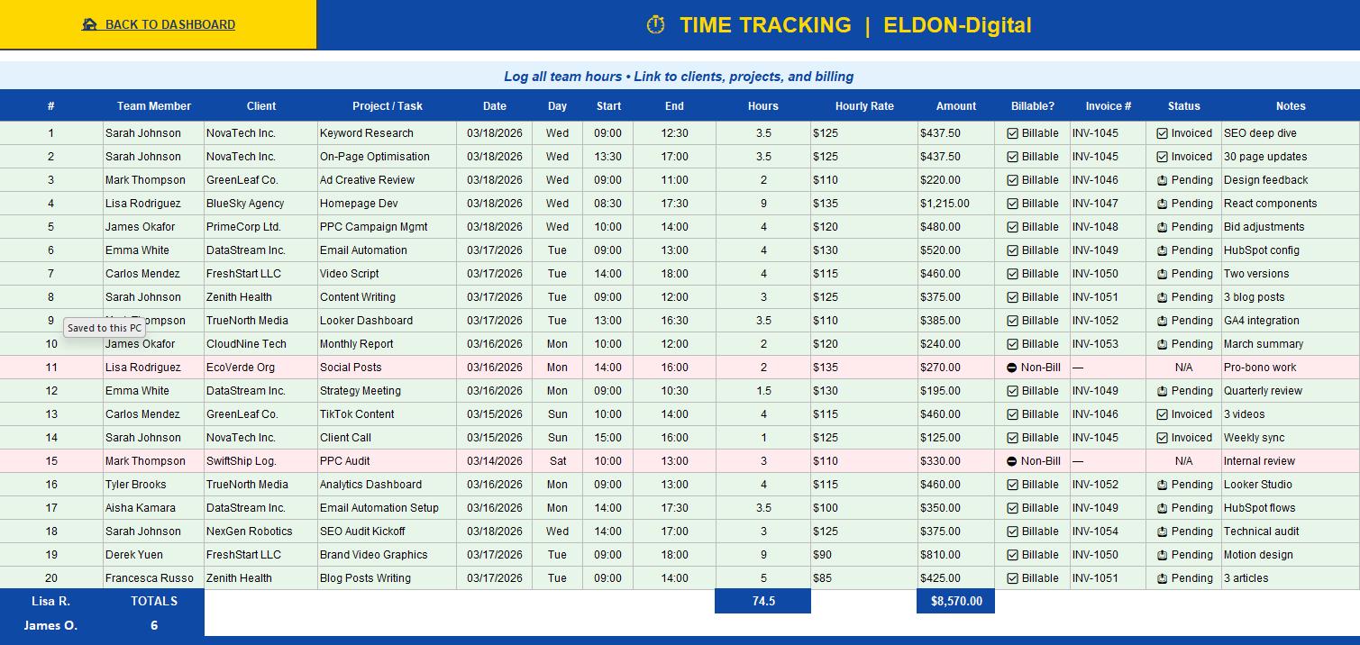 β±οΈ Time Tracking β Log every hour by team member, client, and task. Billable vs. non-billable flagging, automatic amount calculations, and a full weekly hours summary table with utilisation rates.