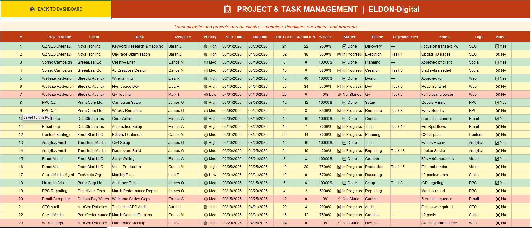 π Project & Task Manager β Track every task with assignees, priorities, deadlines, estimated vs. actual hours, completion percentage, and billing status. Color-coded rows update automatically by status.